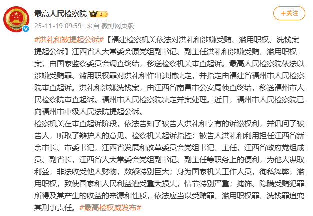新京报讯 据@检察院微博消息,江西省人大常委会原副书记、副主任洪立和涉嫌受贿、滥用职权罪。国家监委调查完毕,移送检察院审查起诉。最高人民检察院以涉嫌受贿罪、滥用职权罪,依法对洪礼和作出逮捕决定,并委托福建省福州市人民检察院侦查起诉。洪立和涉嫌洗钱案由江西省南昌市公安局立案侦查,并移送抚州市人民检察院侦查起诉。福州市人民检察院决定合并审理此案。近日,福州市人民检察院向福州市人民检察院提起公诉。中止人民法院。在审查起诉阶段,检察机关依法告知了被告人洪礼和的审判权利,并对被告人进行了调查,并听取了辩护律师的意见。检察机关指控,被告人洪立和利用担任江西省西泥路市长、市委书记、江西省发展和改革委员会党组书记、主任,江西省人民政府党组成员、副主任,江西省人民政府党组副书记、副主任职务上的便利。江西省人大党组认为,为他人谋取利益,非法收受他人财物。财产数额特别大;作为国家机关工作人员,谋取私利、滥用职权,给国家和人民利益造成重大损失,情节特别严重的;隐瞒、隐瞒受贿犯罪所得及其来源、性质的,依法以受贿罪、滥用职权罪、财物损失罪追究刑事责任。辛静编辑