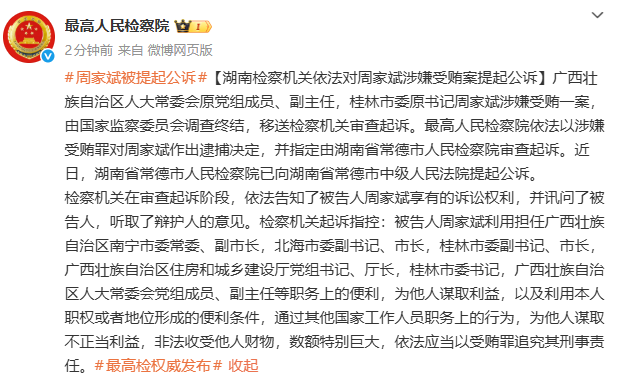 新京报讯 据@高级检察院微博消息,广西壮族自治区人大常委会原委员、副主任、桂林市委原书记周家斌涉嫌受贿罪。国家监委调查完毕,移送检察院审查起诉。高级人民检察院以涉嫌受贿罪依法对周家斌作出逮捕决定,并委托湖南省常德市人民检察院侦查起诉。近日,湖南省常德市人民检察院向湖南省常德市中级人民法院提起公诉。在审查起诉阶段,检察机关依法告知被告人周家斌在审判中享有的权利,被告人正在接受侦查。并听取了辩方的意见。检察机关指控,被告人周家斌利用担任广西壮族自治区南宁市委常委、副市长,北海市委副书记、市长,桂林市委副书记、市长,市委、市长党组书记、处长,广西壮族自治区住房和城乡建设厅党组书记、厅长,广西壮族自治区住房和城乡建设厅党组书记、厅长,桂林市委常委、广西壮族自治区人大常委会委员。利用班组成员、副主任等职务便利,利用职权、地位的便利,在国家机关履行其他国家职能的过程中,为他人谋取不正当利益的行为。职务犯罪,非法收受他人财物,数额特别巨大的,依法追究受贿罪的责任。辛静编辑